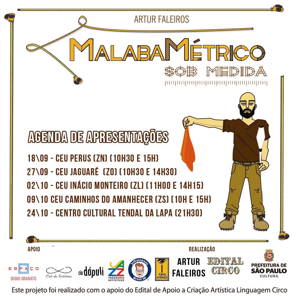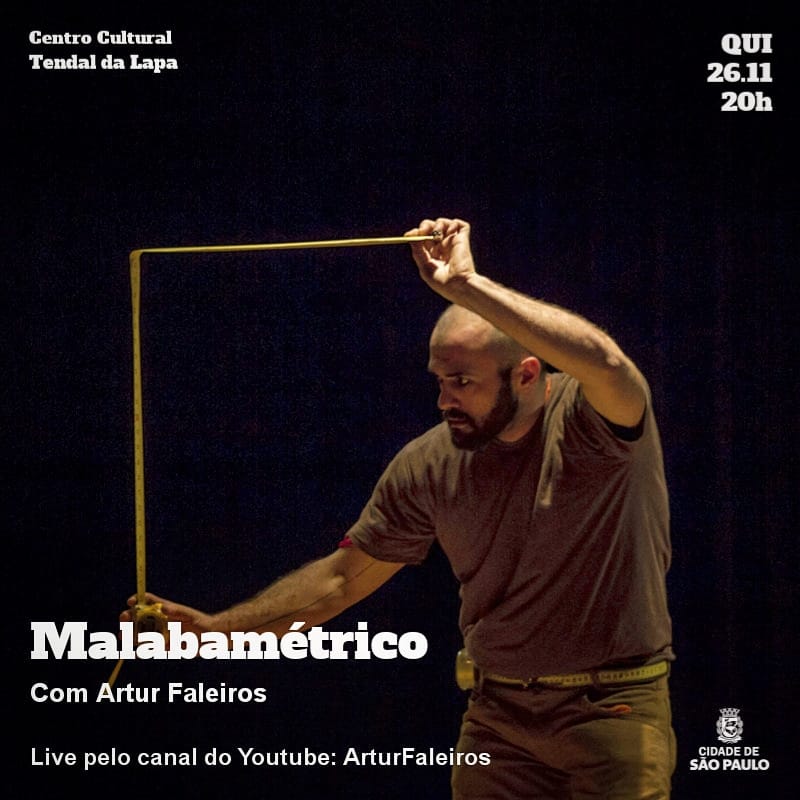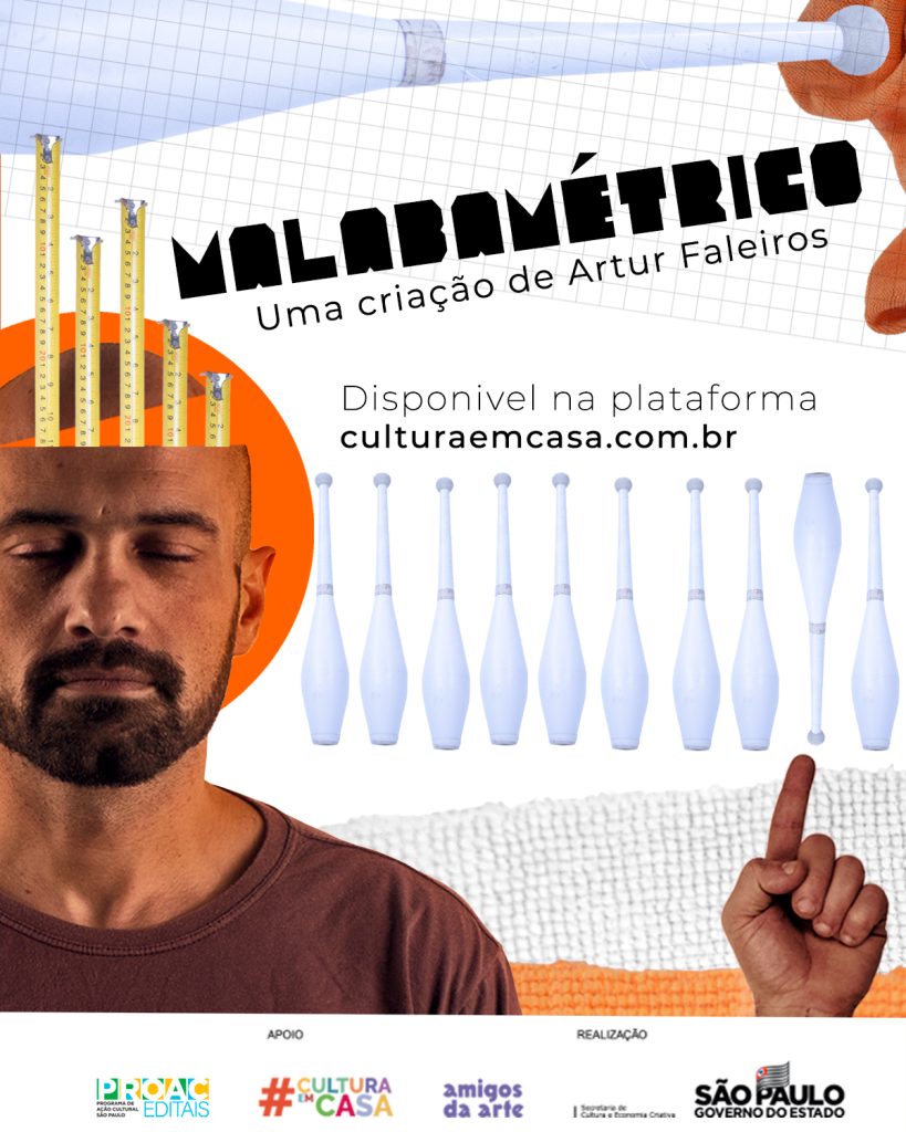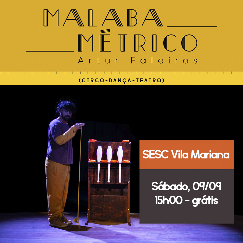 MALABAMÉTRICO é uma obra solo de circo-dança-teatro com criação e interpretação de Artur Faleiros. Em cena uma personagem busca fazer uma apresentação perfeita e luta contra suas próprias paranóias para realizar malabarismos na medida! Uma coreografia milimetricamente marcada, permeada de improvisações absurdas que unem malabarismo, acrobacia e dança com toques de limpeza.