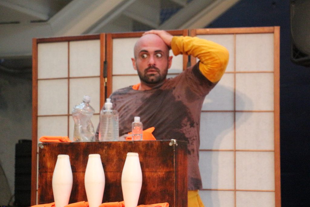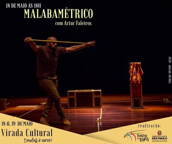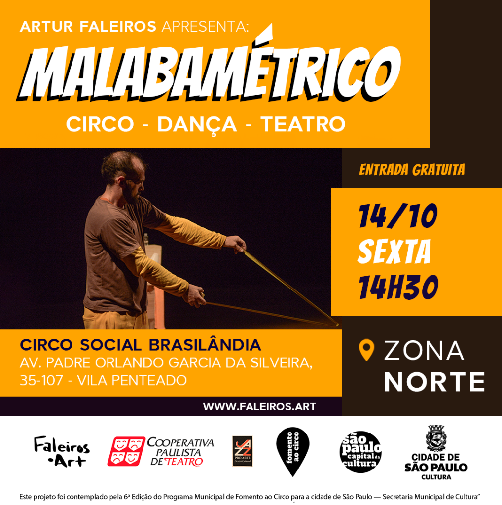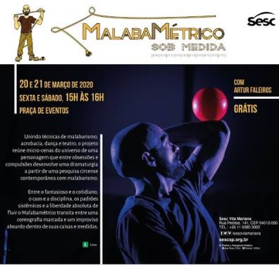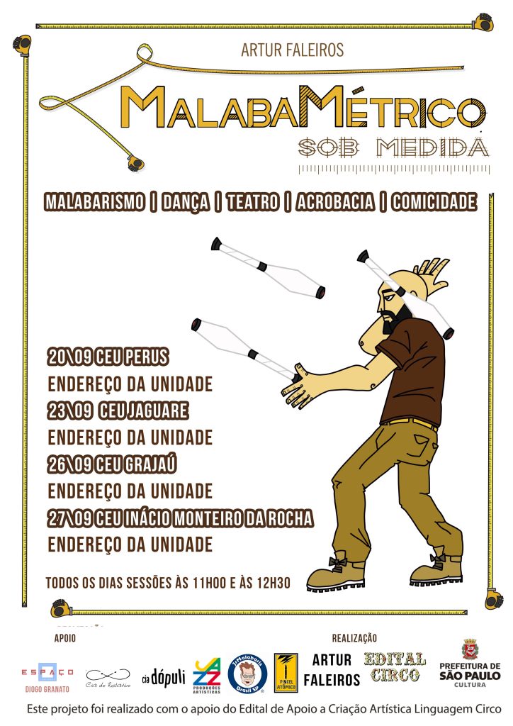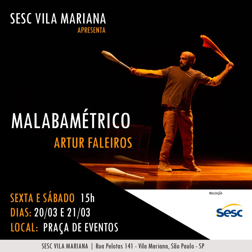 MALABAMÉTRICO é uma obra solo de circo-dança-teatro com criação e interpretação de Artur Faleiros. Em cena uma personagem busca fazer uma apresentação perfeita e luta contra suas próprias paranóias para realizar malabarismos na medida! Uma coreografia milimetricamente marcada, permeada de improvisações absurdas que unem malabarismo, acrobacia e dança com toques de limpeza.