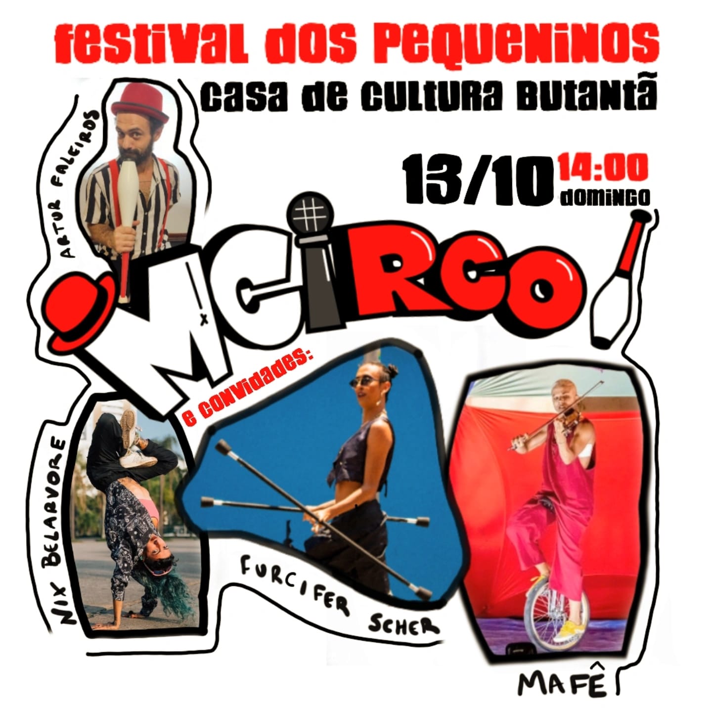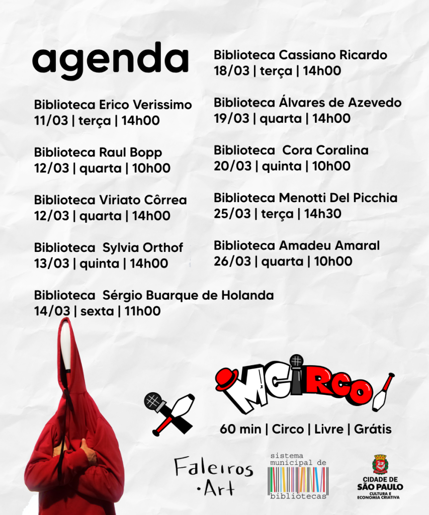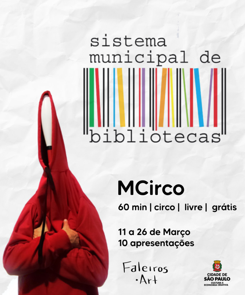De 11 a 26 de março de 2025 o espetáculo #MCirco entra em circulação pelo Sistema Municipal de Bibliotecas com 10 apresentações. Todas as apresentações são gratuitas. Para a circulação o espetáculo conta com a participação especial do artista “Malabá”, Gabriel Santos. Acompanhe a agenda e chega junto!