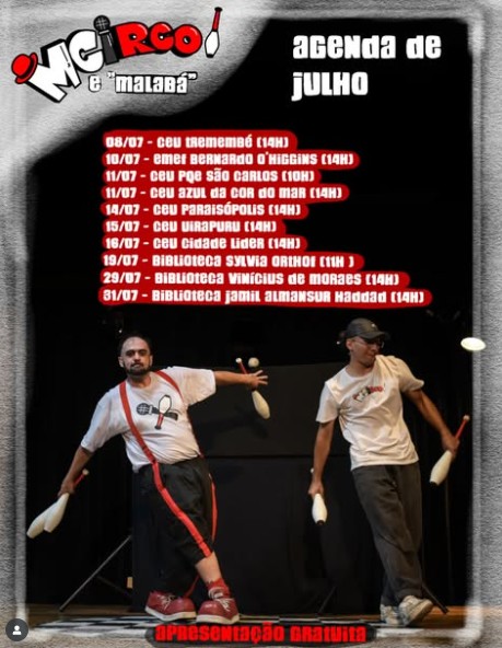 Em julho de 2025 #MCirco foi convidado para 10 apresentações circulando 3 Bibliotecas Municipais e mais 7 Escolas Municipais pelo projeto Recreio nas Férias.