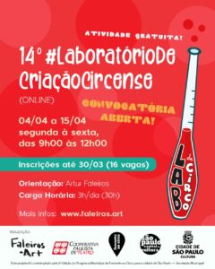 O LAB Cursos é um dos desdobramentos do @labdecirco e da #ResidênciaAutônoma – Faleiros.Art. Entre Abril e Agosto de 2022 o projeto teve uma edição por mês com cursos de técnicas e linguagens complementares ao desenvolvimento de espetáculos circeses solos. Foram cinco edições gratuitas realizadas junto ao 6º Fomento ao Circo com média de 15 artistas participantes por edição com suas respectivas criações em andamento.